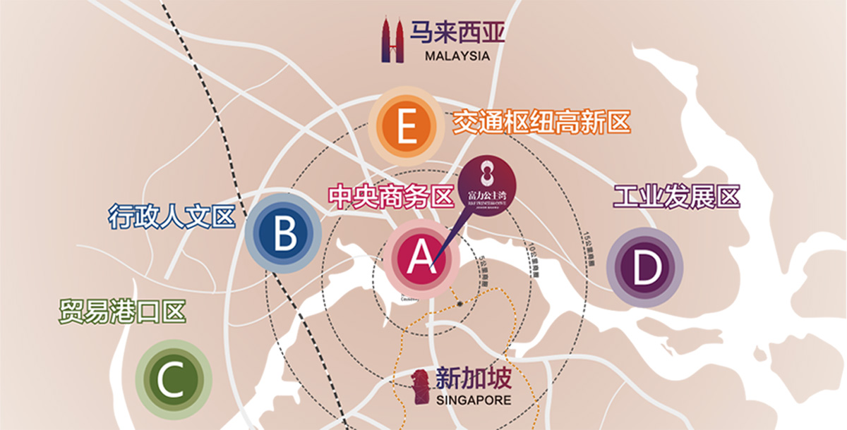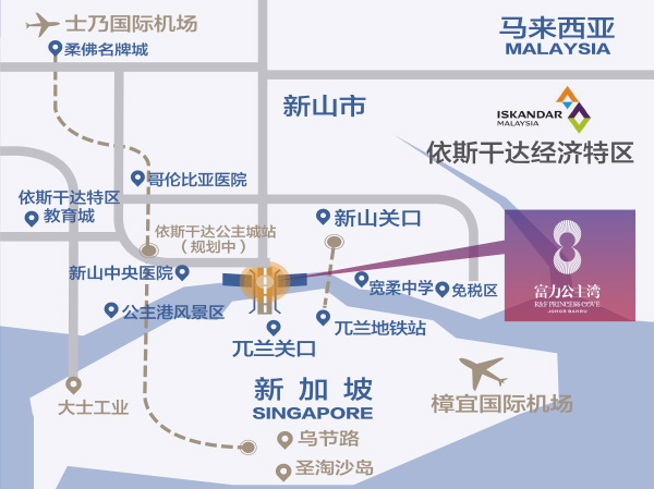 富力公主湾位于马来西亚第二大城市,有着“大马南门户之称”的新山市,与新加坡隔着柔佛海峡相望,紧靠连接“新山-新加坡”的新柔长堤,距新加坡仅1056米。富力公主湾地处新马依斯干达经济特区中央商务区、占据新山重要价值的地段,扼守新马往来咽喉要道——新马第一关口。富力公主湾配备业主专属CIQ连桥,直达新山关口,无缝对接新柔RTS(新加坡-新山)地铁,一站地铁直接通关抵达新加坡。