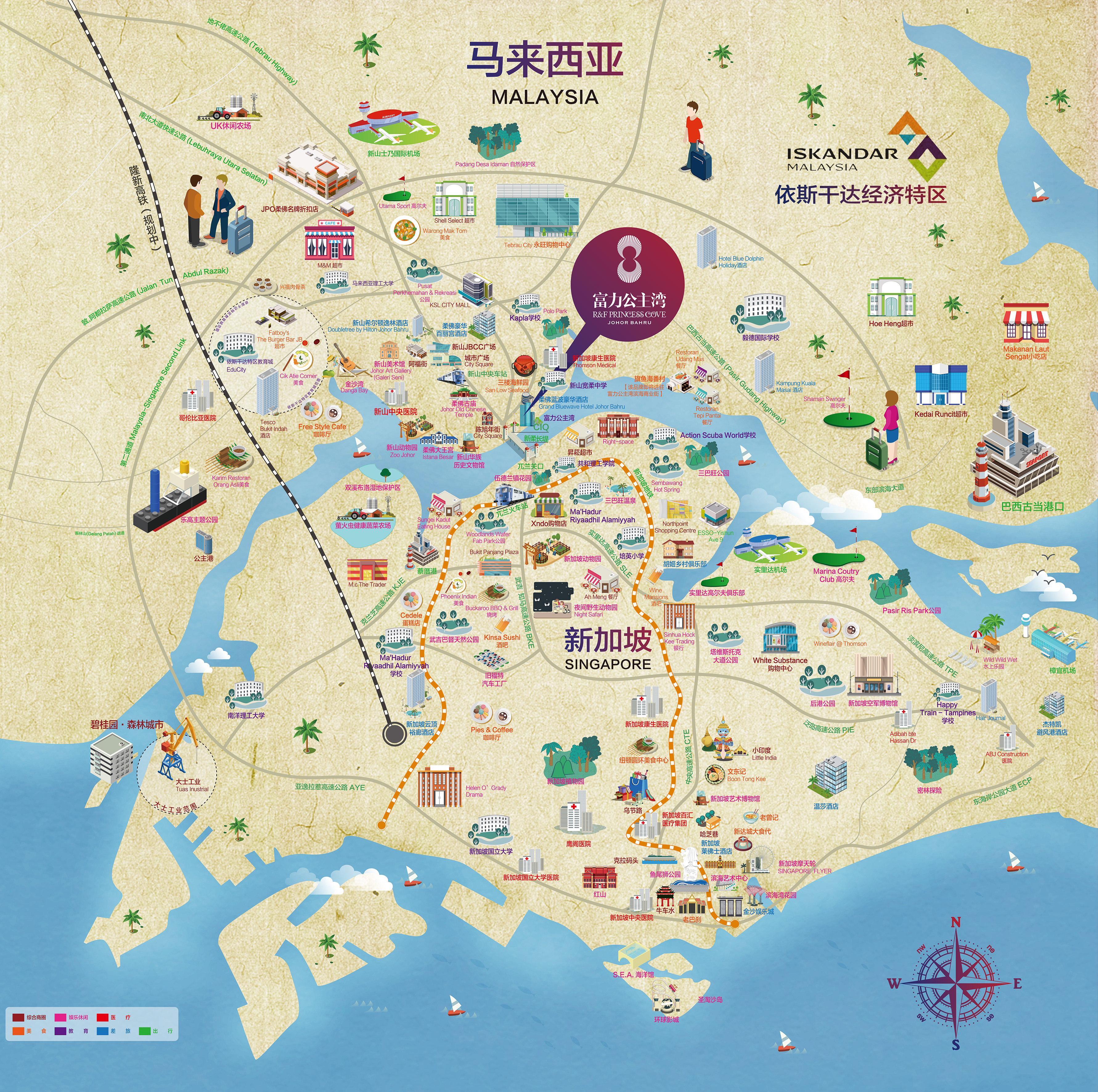 富力公主湾周边配套一图尽览!拥新马双城繁华,享国际便捷生活:乌节路、牛车水、新山等繁华商圈;City square、JPO柔佛名牌折扣店等超级购物中心;滨海湾花园、鱼尾狮公园等风景名胜;毅然德国际学校、宽柔中学、依斯干达教育城等学府资源;新加坡康生医院、新山中央医院等医疗机构;新柔RTS地铁、新加坡樟宜机场等交通路网……