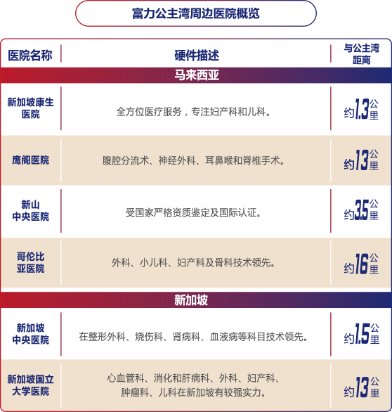 新加坡康生医院是新马地区的大型综合性医院,医院将入驻富力公主湾对面的医疗城,医院距离项目仅1.3公里,建