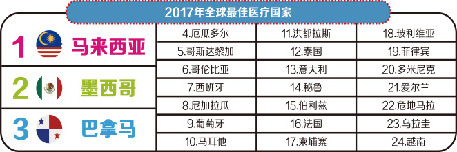 美国《国际生活》杂志公布的2017年全球医疗国家排名,马来西亚以自身先进的医疗技术以及完善的医疗设施、高质量的服务等,位居全球前列。